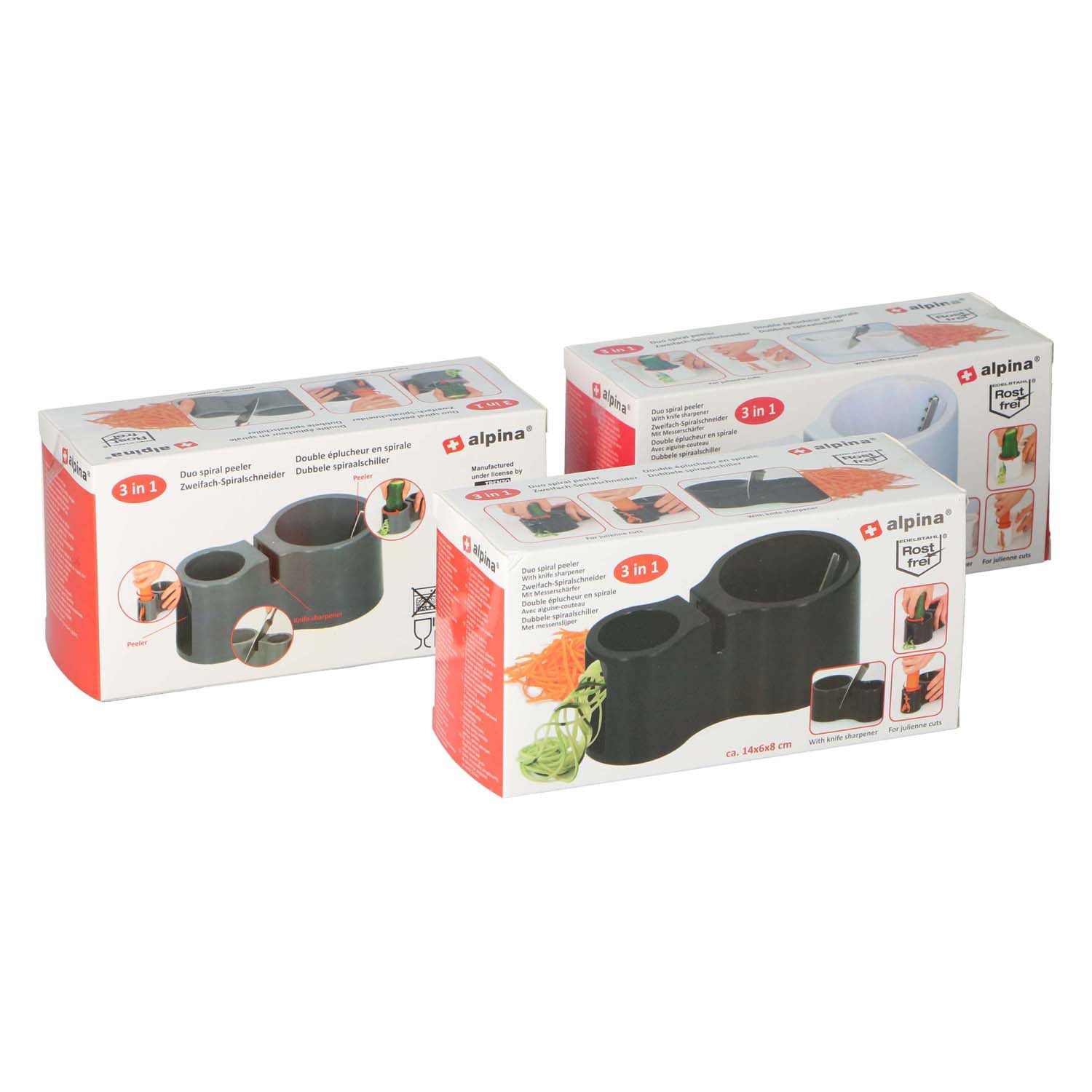 De Alpina 3-in-1 spiralenschiller is ideaal voor het snijden van groenten in stijlvolle spiralen. Perfect voor gezonde maaltijden en creatieve gerechten. De verpakking bevat drie verschillende doosjes voor variatie in snijvormen. Afmeting: 14 x 6 x 8 cm. Niet geschikt voor kinderen.