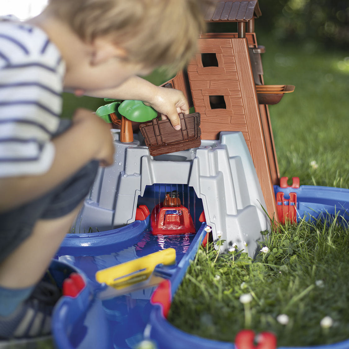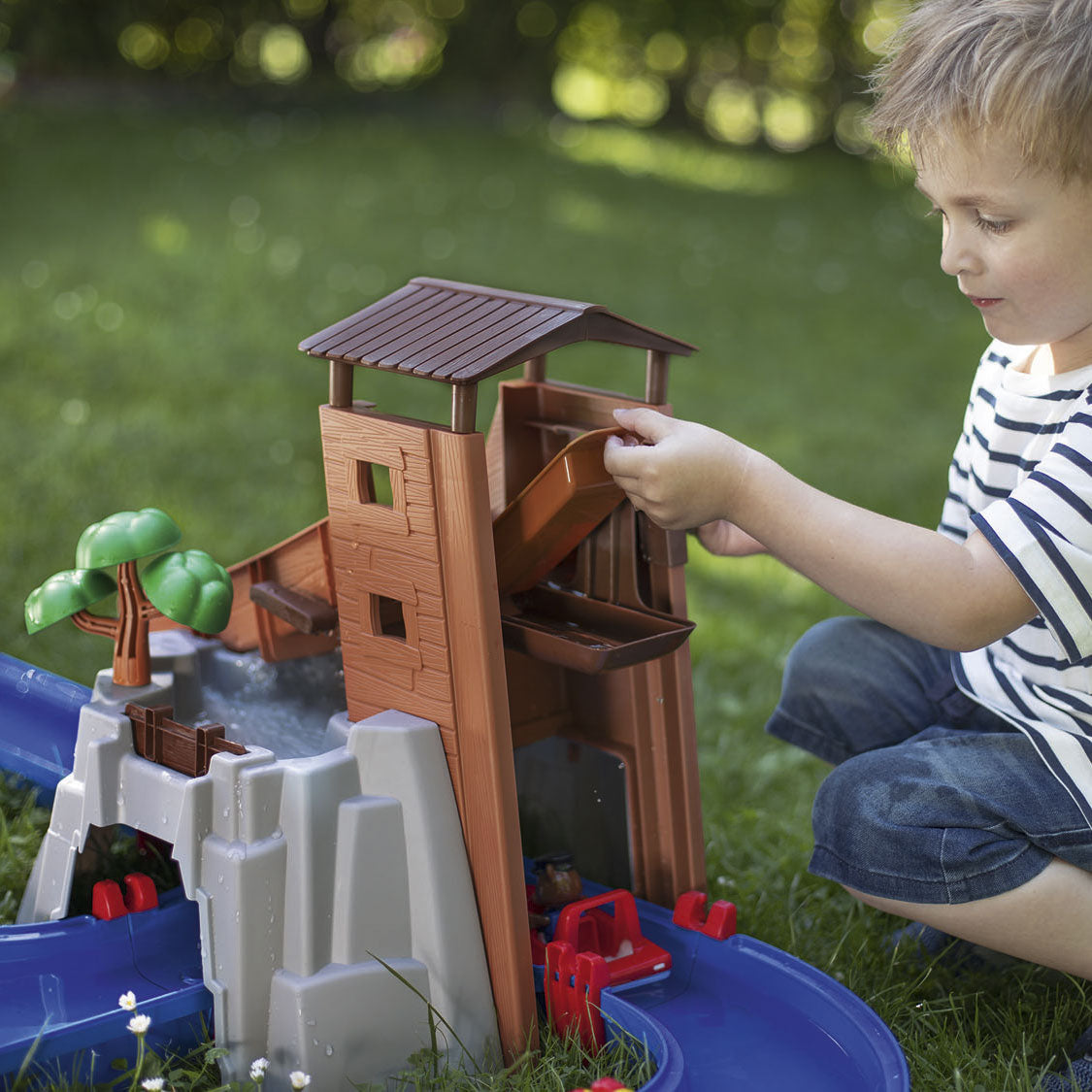 Wat een fantastische waterbaan is dit Adventure Land van AquaPlay! Beer en Krokodil beleven de gekste dingen in deze wildwaterbaan! Veroorzaak stroming met de hendels, laat ze van de glijbaan af gaan, vaar onder de waterval door en blokkeer de baan zodat ze weer de andere kant op moeten! Urenlang speelplezier met deze mooie waterset. Inhoud: 69 delen om de baan in elkaar te zetten, 2 speelfiguren en 2 bootjes. Gemaakt van kunststof, afmetingen van de baan: 138 bij 88 bij 47 centimeter. Deze set wordt geleverd in een fotodoos in AquaPlay stijl.