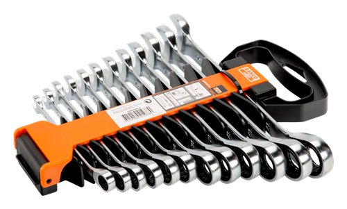 Steekringratelsleutelsets, metrisch Bekstand van 15° met een smallere kop voor betere toegang Bekstand 15° voor ruimte voor de knokkels of een betere grip Omschakelknop voor snelle verandering draairichting: links/rechts Grotere maataanduiding in twee richtingen, voor snelle herkenning Ratel in de ring voor een hoge productiviteit in toepassingen Wordt geleverd in een kunststof houder Dynamic-Drive™-twaalfkantprofiel biedt langere levensduur van schroeven en moeren Verchroomd micromatte afwerking voor een hoogwaardig oppervlak Hoogwaardige staallegering Sneller vastdraaien van bevestiging door de ratelwerking in het ringuiteinde Eenvoudiger in gebruik bij weinig ruimte, dankzij hoek van 5° Normen: ISO 1711-1 en DIN 3113