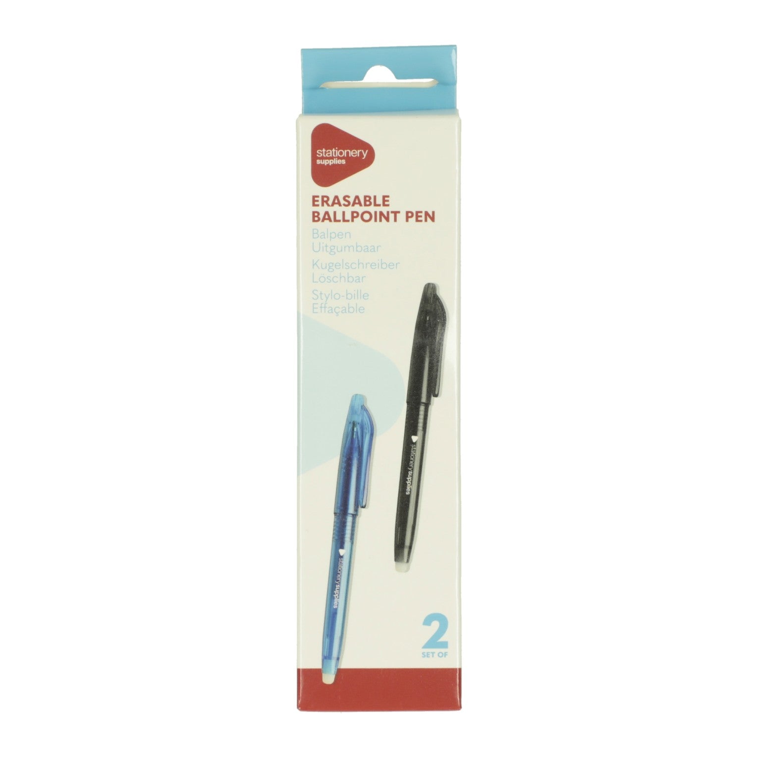 Balpennen met gum. In de verpakking zitten 2 pennen waarvan 1 blauwe en 1 zwarte. Op de achterkant van de pennen zit een gummetje waarmee gegumd kan worden.