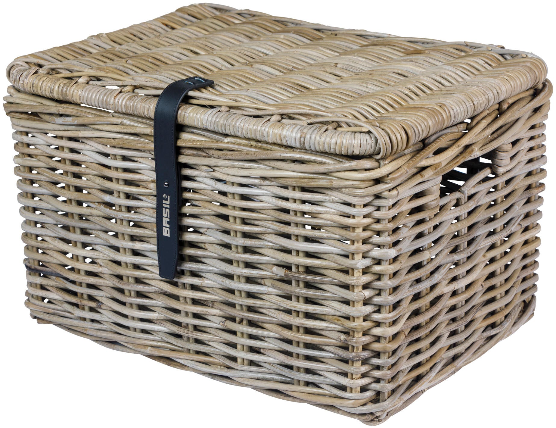 Basil Dax L, rotan fietsmand, rechthoekig, deksel met sluiting, excl. bevestigingsmateriaal, grijs De Basil Dax L met deksel is een stijlvolle en ruime rotan fietsmand, ideaal voor het vervoeren van boodschappen, een schooltas of andere spullen. Dankzij de prachtige vorm en elegante grijze kleur past deze mand perfect op elke fiets. De deksel met lederen sluiting zorgt ervoor dat je spullen veilig opgeborgen blijven tijdens het fietsen. Eigenschappen: