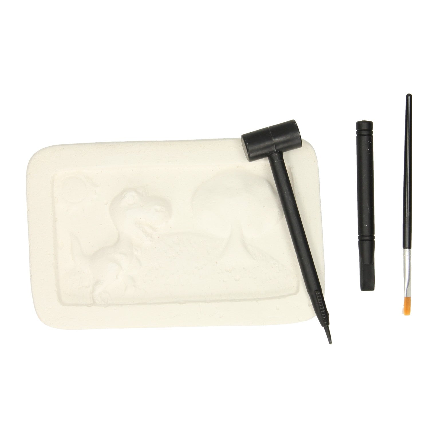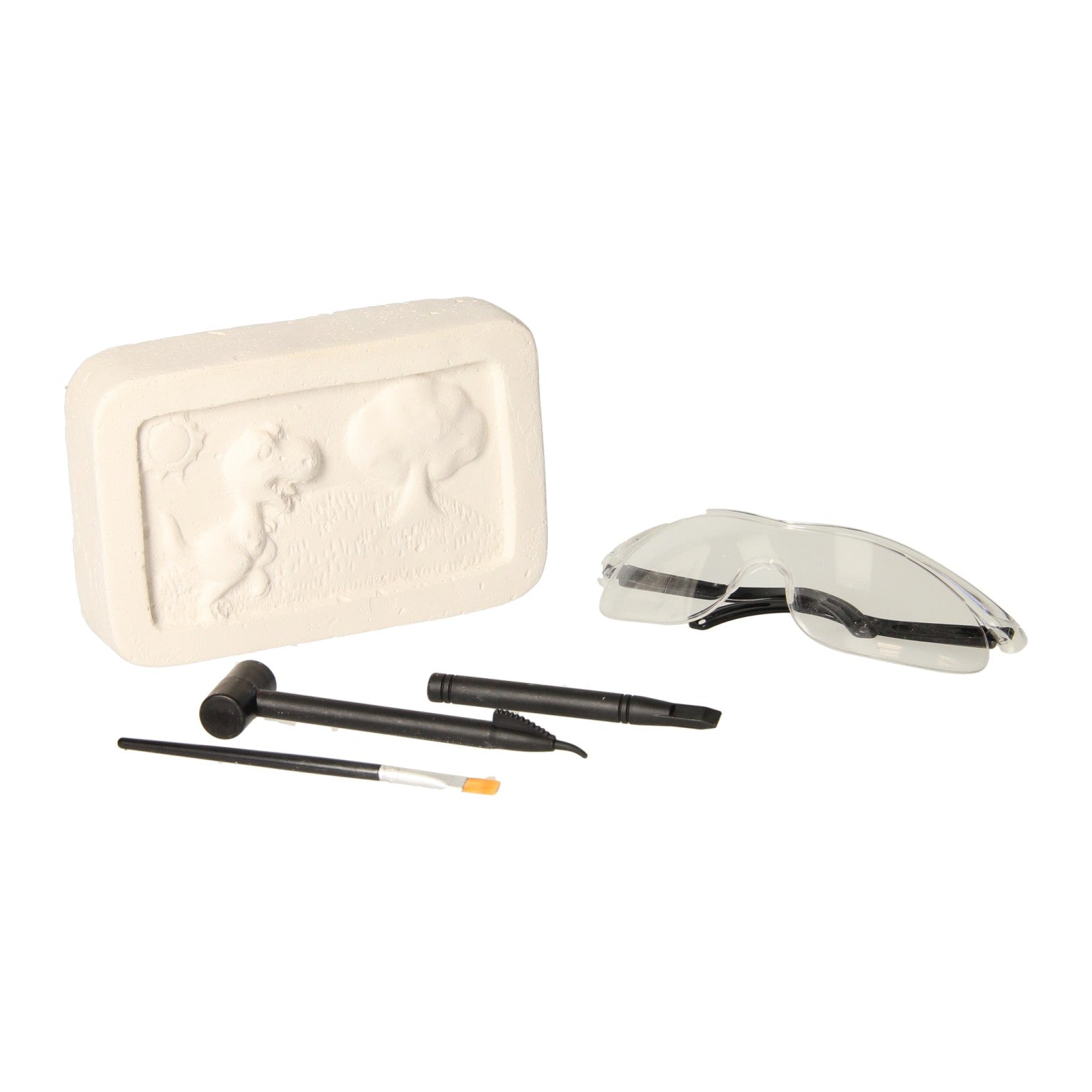 Set waarmee dinosaurusfossielen opgegraven kunnen worden. In de verpakking zit een in het gips begraven dinosaurusfossiel. Met een hamer, beitel, kwast en waterpompje verwijder je voorzichtig het fossiel uit het gips. In de verpakking zit één gipsblok, hamer, beitel, kwast, waterpompje en veiligheidsbril.