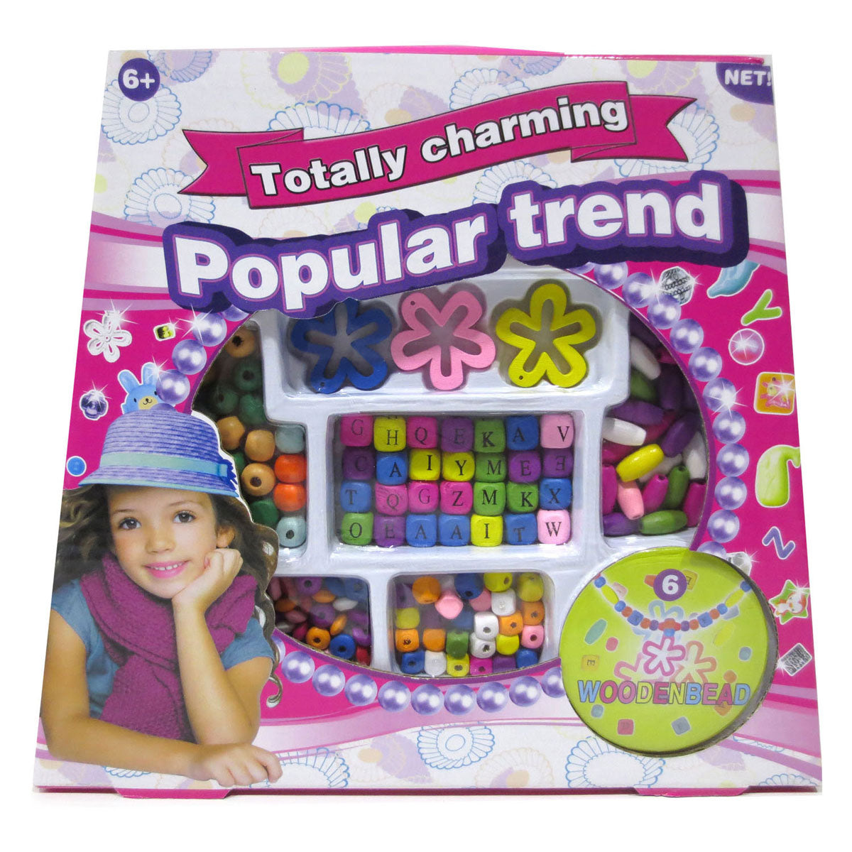 Kralenset met verschillende vormen en kleuren houten kralen: grote bloemen, letterkralen, ronde kralen, langwerpige kralen en meer! Geschikt vanaf 6 jaar.