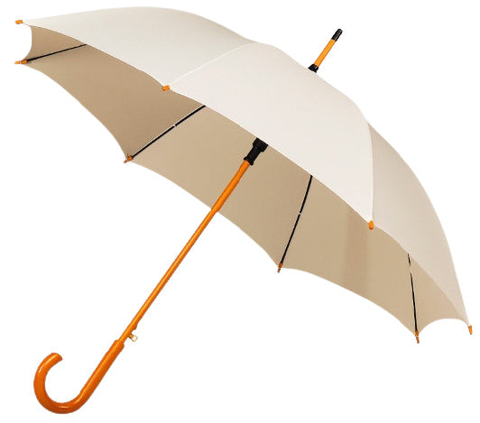 Impliva trouwparaplu Deze mooie offwhite paraplu met houten stok van Impliva geeft jou beschutting tijdens een regenbui. De windbestendige constructie zorgt dat de paraplu zelfs de sterkste windvlagen kan weerstaan. Hij heeft een elegante kleur en opent automatisch. Zo ben jij binnen een handomdraai beschermd tegen de regen. Met het haakvormig handvat hang je de paraplu eenvoudig te drogen. Specificaties: Kleur doek: wit Kleur frame: bruin Geslacht: unisex Materiaal doek: polyester Materiaal stangen: fiberglass Materiaal handvat: hout Diameter: 102 cm Hoogte: 89 cm Aantal ribben: 8