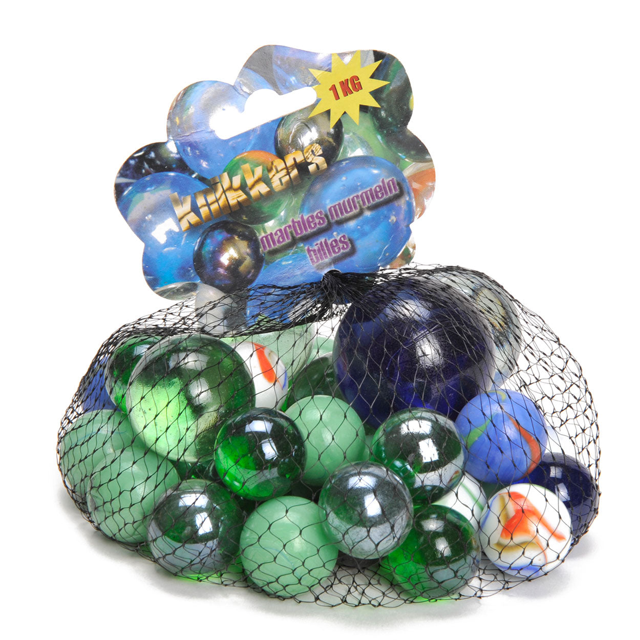 Een net vol knikkers van verschillende maten en kleuren. De knikkers wegen samen 1kg. Zorg dat je wint met knikkeren en je verzameling knikkers wordt nog groter!