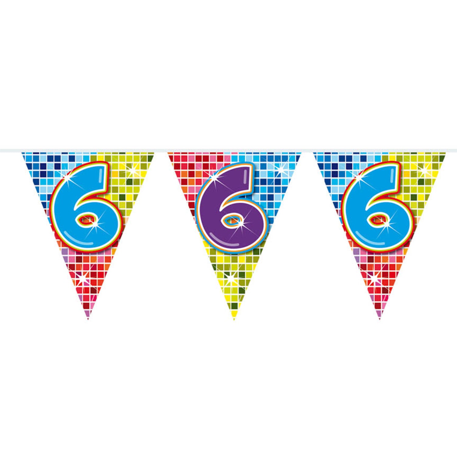 Wordt er iemand 6 jaar? Of vieren jullie een 6-jarig jubileum? Deze kleurrijke slinger staat perfect op ieder soort feestje! De slinger is enkelzijdig bedrukt, heeft 12 vlaggetjes en is 3 meter lang.