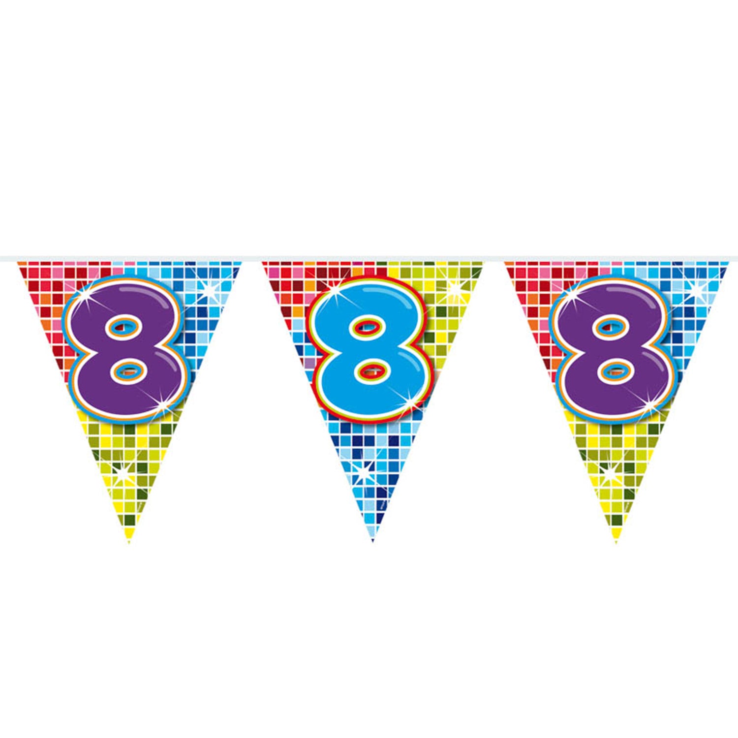 Wordt er iemand 8 jaar? Of vieren jullie een 8-jarig jubileum? Deze kleurrijke slinger staat perfect op ieder soort feestje! De slinger is enkelzijdig bedrukt, heeft 12 vlaggetjes en is 3 meter lang.