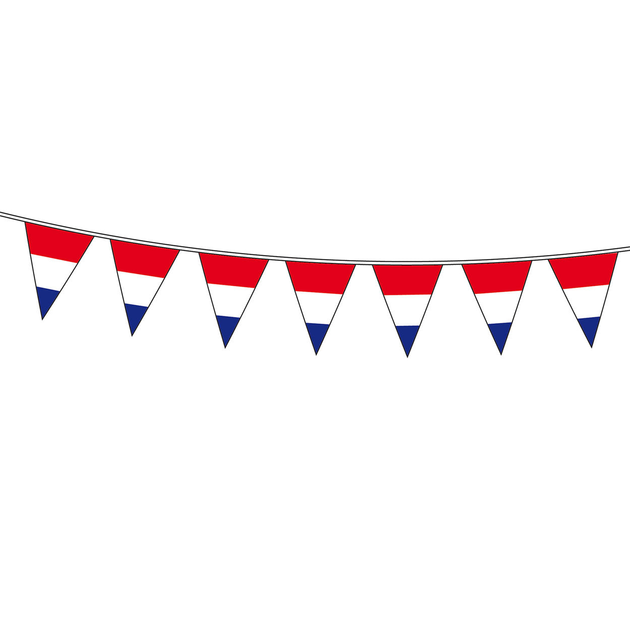 Versier alle oranjefeesten en steun de Nederlandse sportwedstrijden met deze Rood Wit Blauwe vlaggenlijn. De kunststoffen vlaggetjes zijn 30 cm hoog en aan beide kanten bedrukt.
