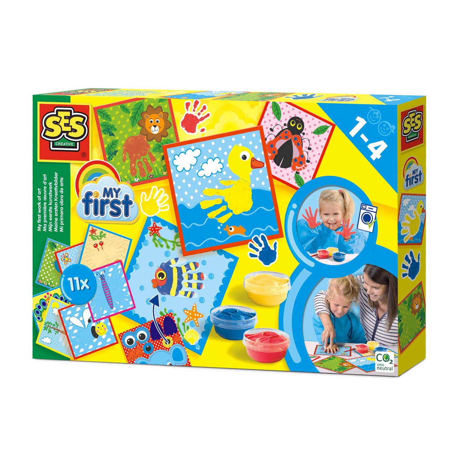 Artikelnr. SES 14419. is de perfecte manier voor ouders om hun kindje kennis te laten maken met verf. De set bevat vrolijke voorbedrukte kaarten, waarop staat aangegeven waar je je hand (of voet) kunt plaatsen. Smeer het handje in met verf en plaats het op de kaart. Met de drukwerk details maak je het helemaal af. Het resultaat is altijd goed! Deze set bevat 11 voorbedrukte kaarten, stickervel, kwastje, 3 potjes vingerverf en instructies. De vingerverf van SES is goede en veilige vingerverf, geproduceerd in Nederland. Goed uitwasbaar uit de meeste textielsoorten.