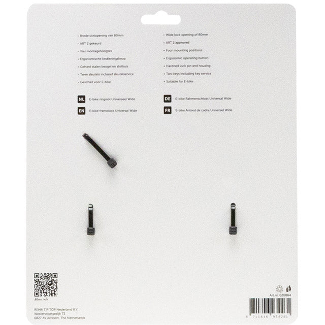 De Simson Universel Wide is een hoogwaardig frameslot met extra brede opening tot bandenmaten van 88mm Het ringslot heeft een ART 2 sterren goedkeur en Simson Sucurity Level van 13 (van 15) hiermee voldoet het slot aan de eisen om een fietsverzekering af te sluiten. De Wide is hierdoor ook uitstekend geschikt voor gebruik op elektrische fietsen. Simson ringslot Universeel Wide, heeft een diameter van 80mm, heeft een ART2 keurmerk en een Security Level van 13/15 en is approved door ENRA