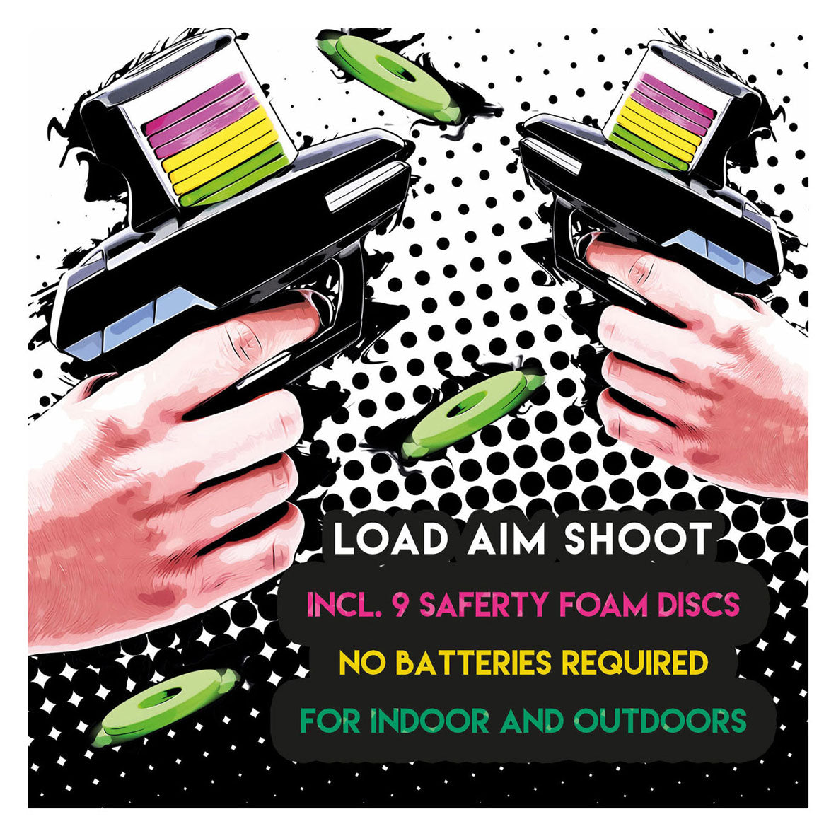 Afschietpistool voor het afschieten van foamdisks. Inclusief 9 gekleurde foamdisks, geschikt voor binnen en buiten. Geen batterijen nodig en geschikt voor kinderen vanaf 6 jaar oud. Afmetingen: 17 x 13,5 x 6 centimeter.